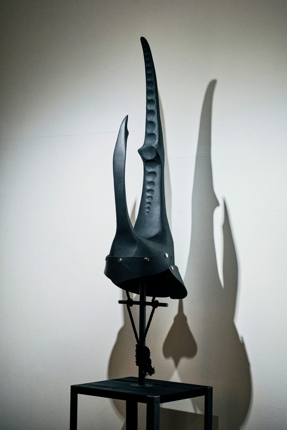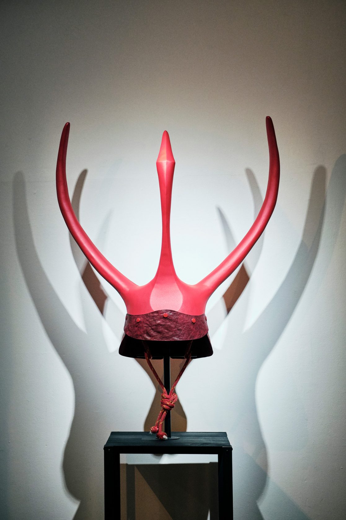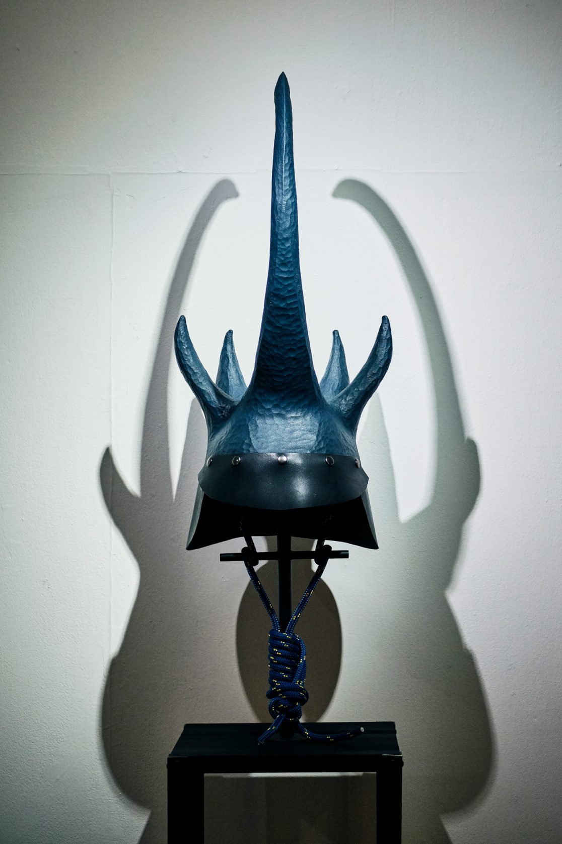 先に生まれたはずの昆虫が、人間が後から生み出した兜に似ていたためにつけられた名前がカブトムシ。 メトニミー(換喩)という言語は、物の代表的な特徴のとこだけ切り取ってものや現象の呼び名にするという意味がある。「カブトムシ×兜」にはそういった換喩的なイメージがあった。私はカブトムシの形の兜を作ることにより本来の形に戻した。