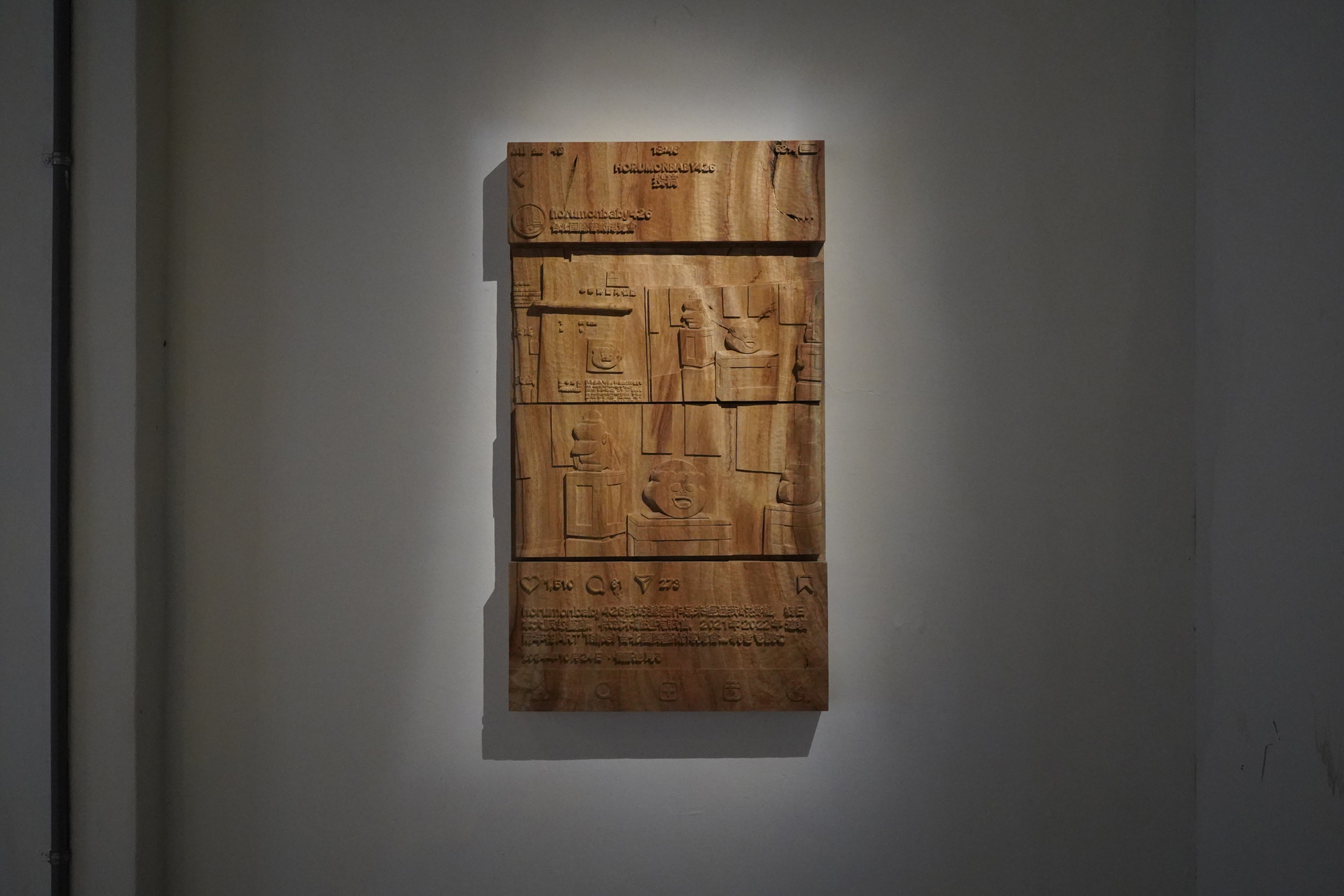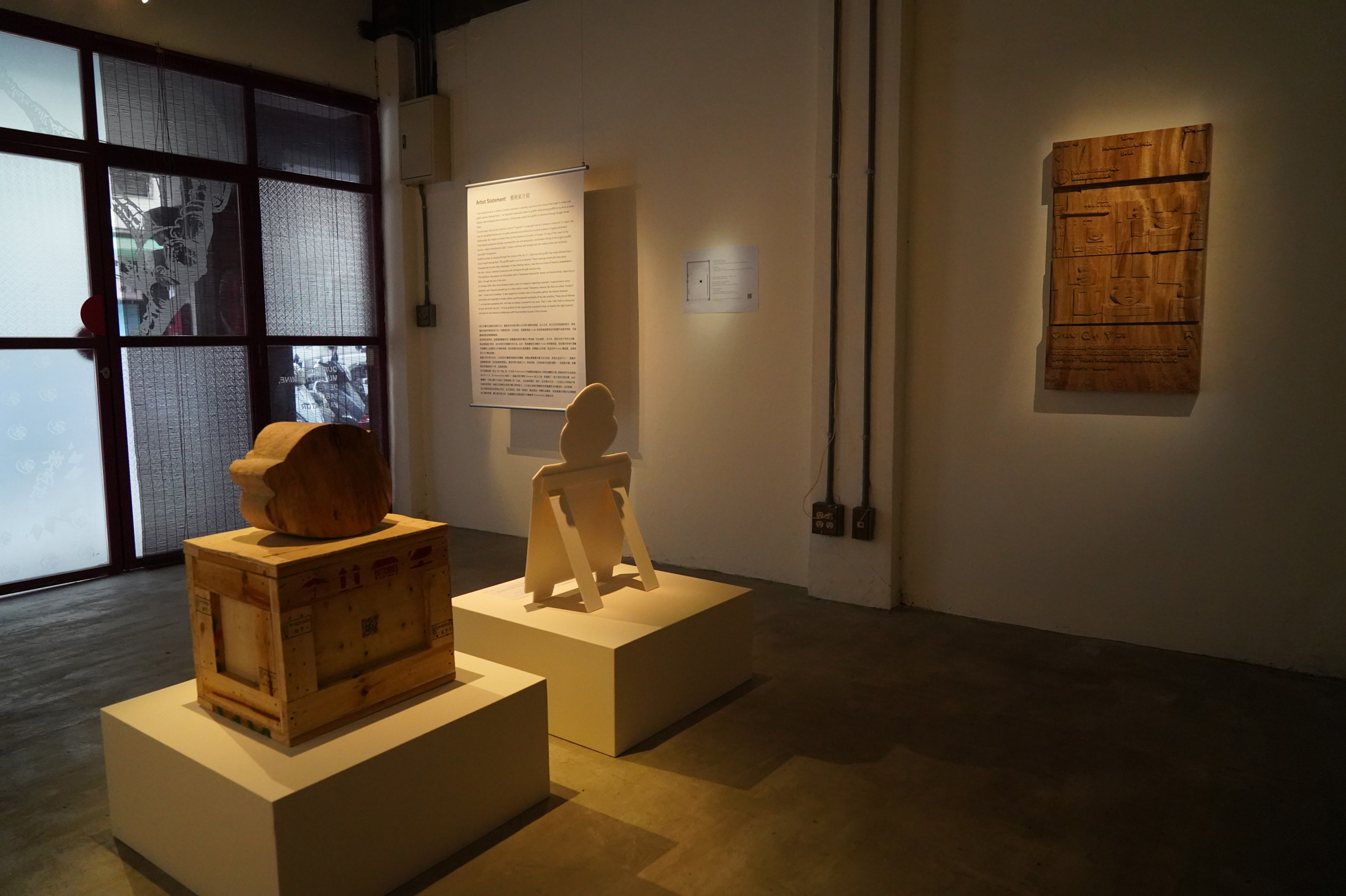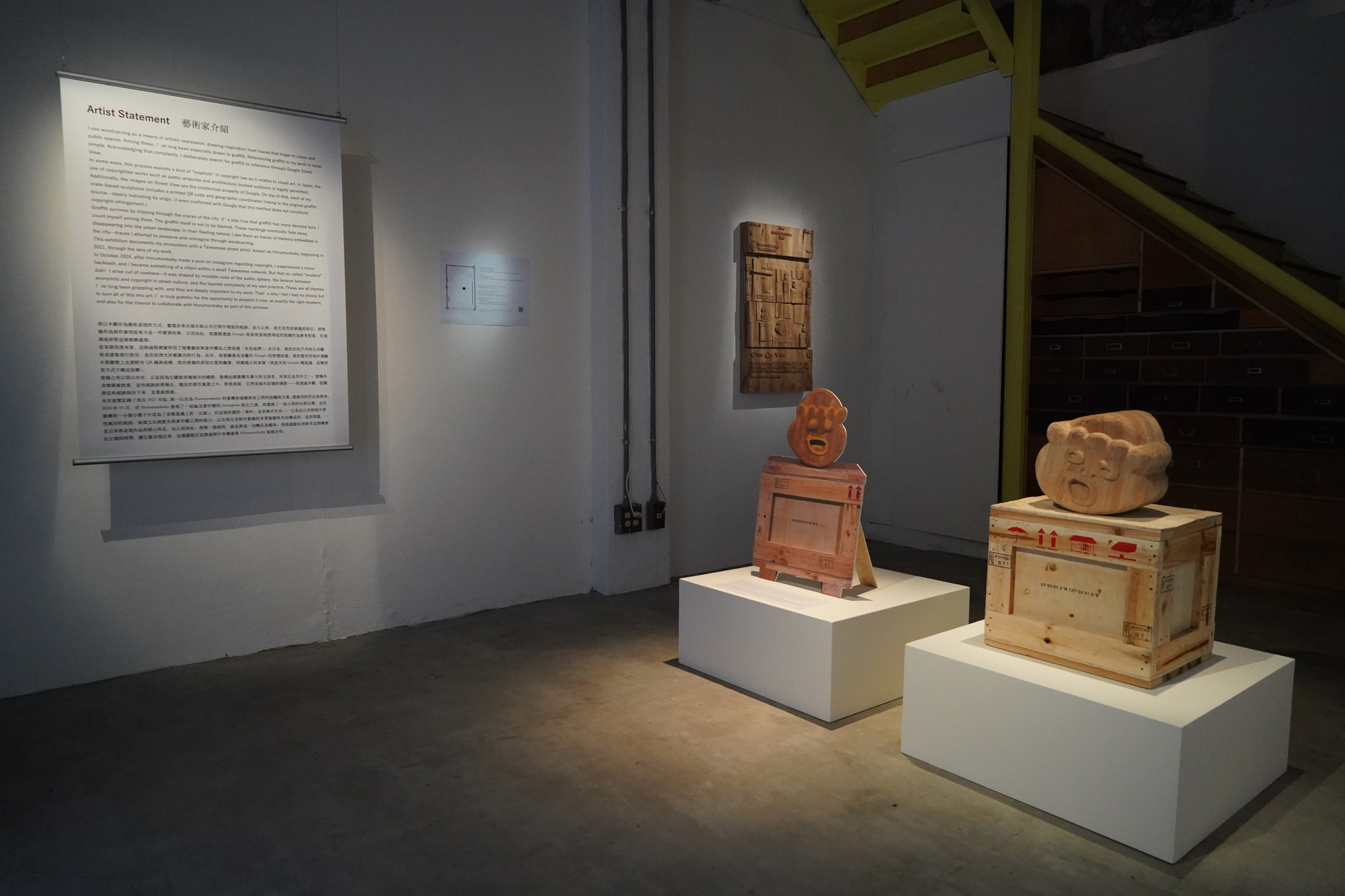 私は、都市や公共空間に潜む痕跡を題材に、木彫を使って美術表現をしている。その中でも特に惹かれてきたのが街に描かれた落書き、いわゆるグラフィティだ。グラフィティを引用して作品をつくることは決して簡単ではない。その難しさを受け入れたうえで、私はGoogleマップのストリートビューを通して、引用元となるグラフィティを探している。グラフィティは都市の隙を突いて生き延びるものであり、器物破損という違法行為である一方で、パブリックの一部として存在してしまっている。その矛盾を抱えながらも、多くのファンがいるのも事実だ。私もその一人だ。描かれたグラフィティには罪はない。それらはやがて儚く消えていく。その刹那的な存在に、私は都市の記憶としての痕跡を感じ、木彫作品として表現している。
